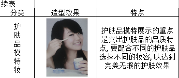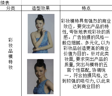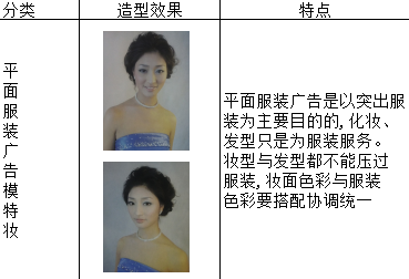 平面化妆的变化空间较大,创意性较强,要根据拍摄要求决定拍摄风格。平面模特妆的分类、造型效果及特点见表3。